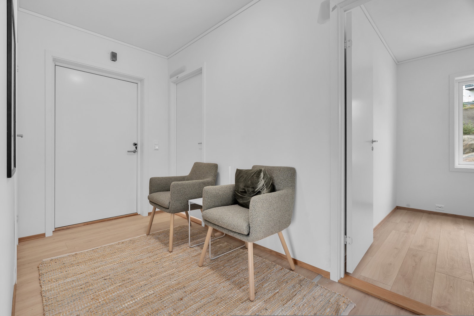 I første etasje kan du gå rett ut i hagen. Her har du ditt eget område, hvor du kan nyte utsikten fra godstolen og rett utover.