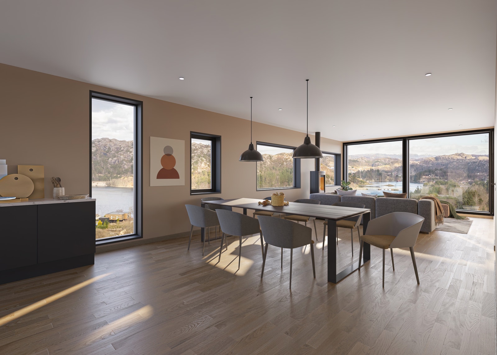 I front av boligen med utsikt ned mot sjøen har vi plassert stuen, og i andre enden kjøkken med utgang til uteområde. En egen foreldrefløy med eget bad og garderobe er også på dette planet.