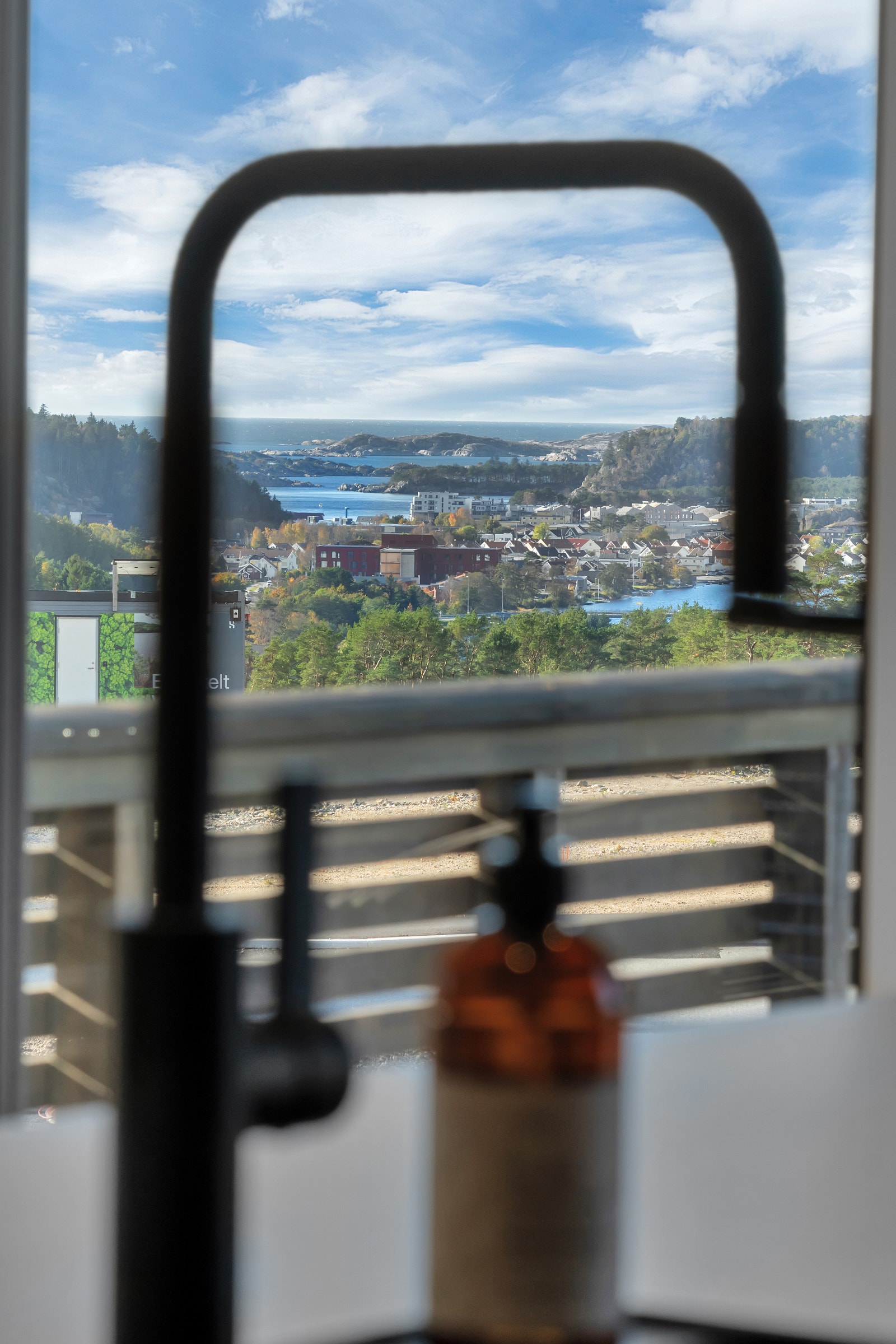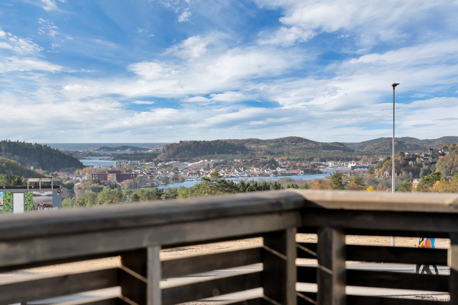 Det er gode solforhold både i hagen og på veranda. P.t er det også utsikt mot Mandal sentrum, men denne vil nok endres etter hvert som boligfeltet utvikles videre.