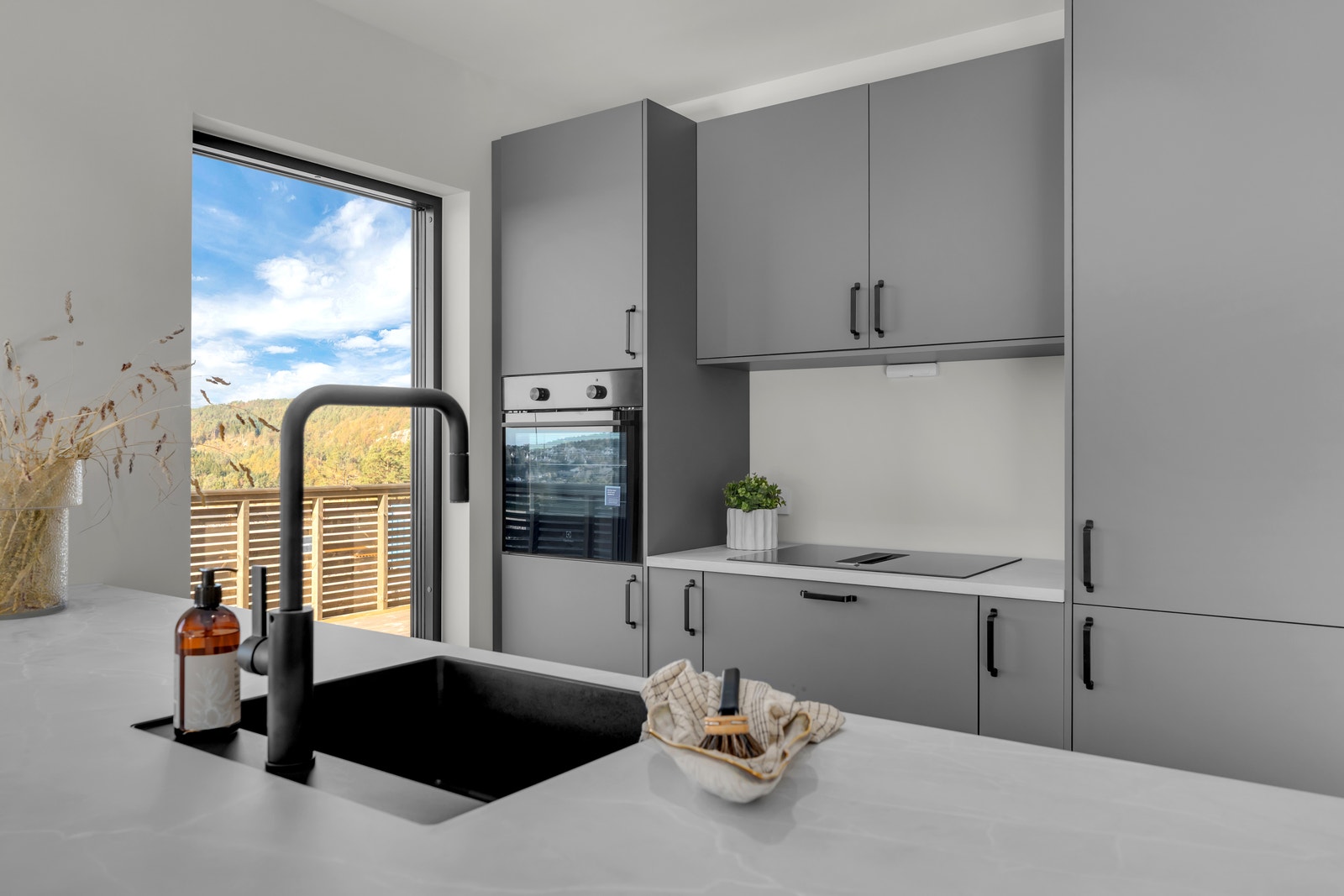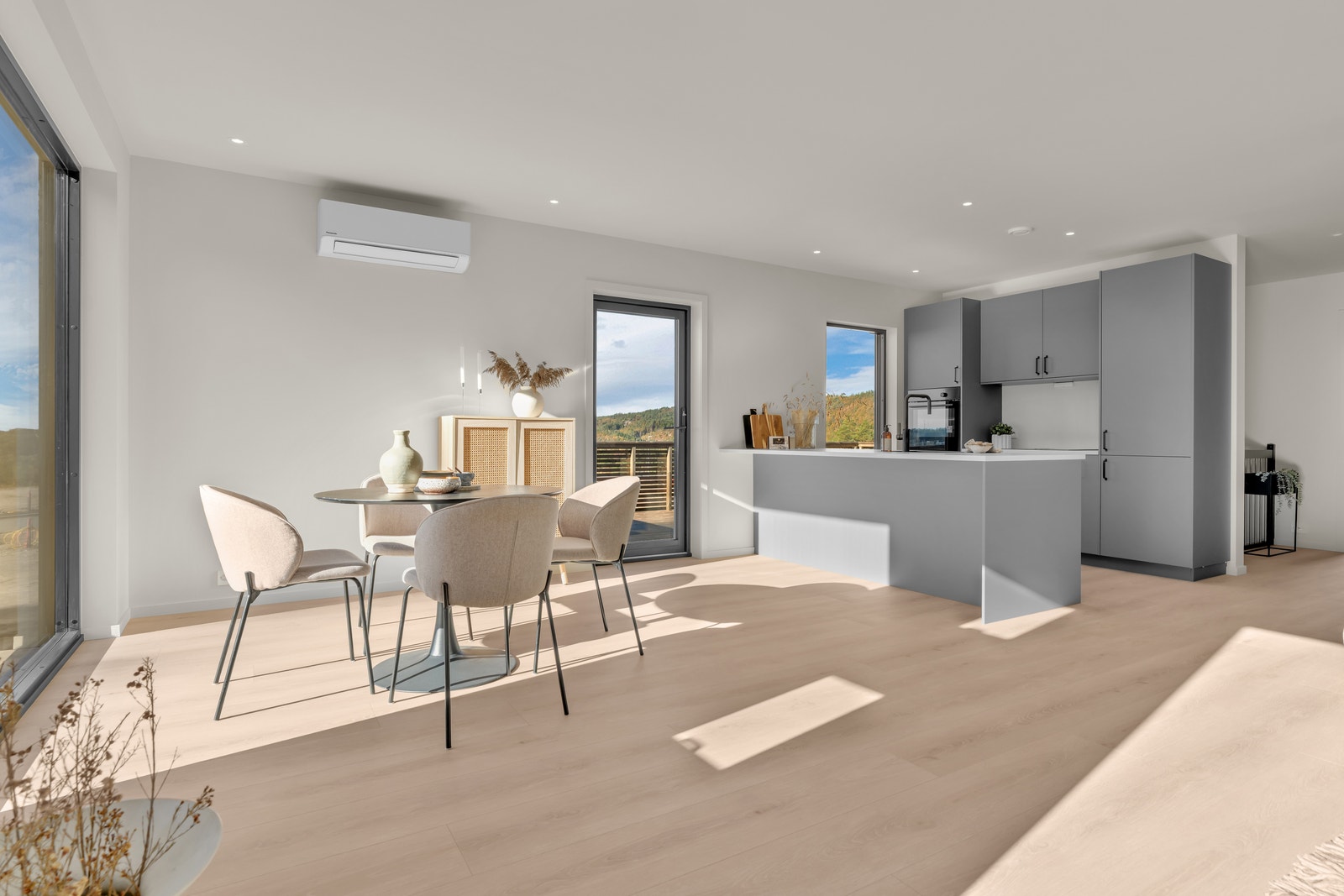 Boligen fremstår i en moderne stil med tidsriktige farger og løsninger.