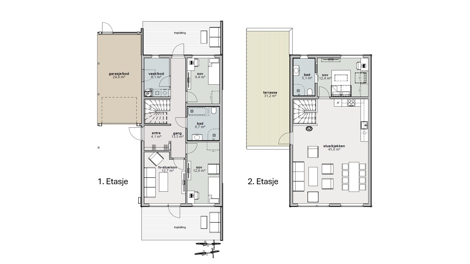 1. etg: Entre, gang, vask/bod, to soverom, bad og tv-stue/soverom