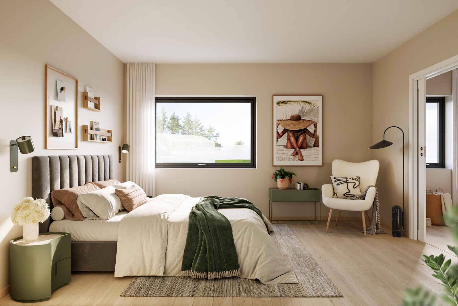 Store vindusflater skaper en lys og behagelig romfølelse gjennom hele året. Her får du en bolig som kombinerer moderne uttrykk med funksjonelle løsninger.