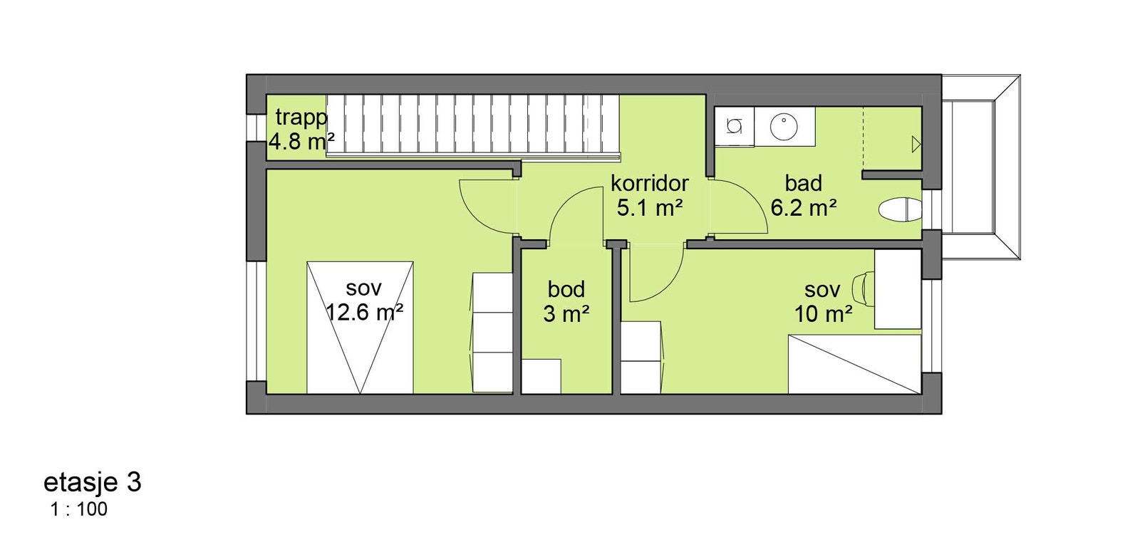 3. etasje: To soverom, bad og bod.