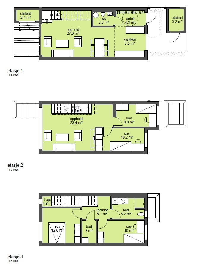 Boligen har en innvendig bod samt to utvendige boder. Det leveres ikke garderobeskap, men dette kan bestilles som tilvalg hos Sigdal.