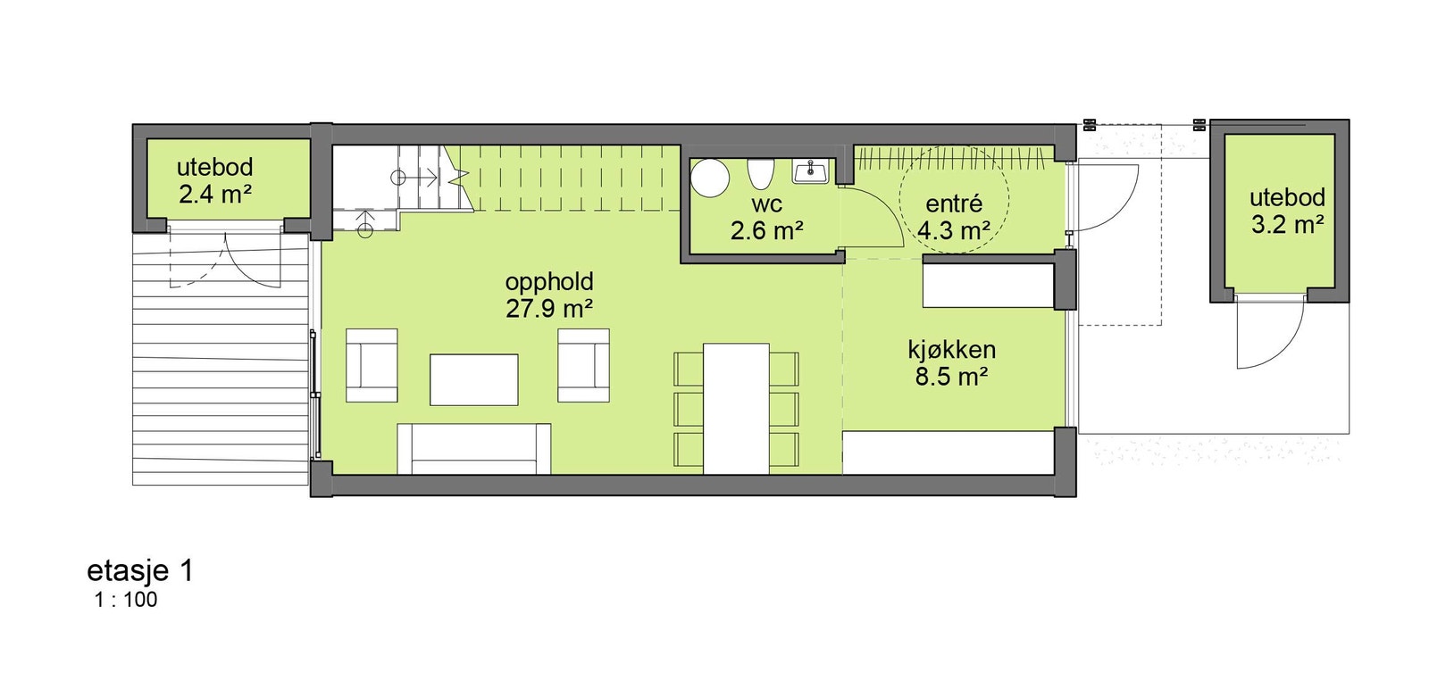 1. etasje: Entré, wc, kjøkken og stue.
