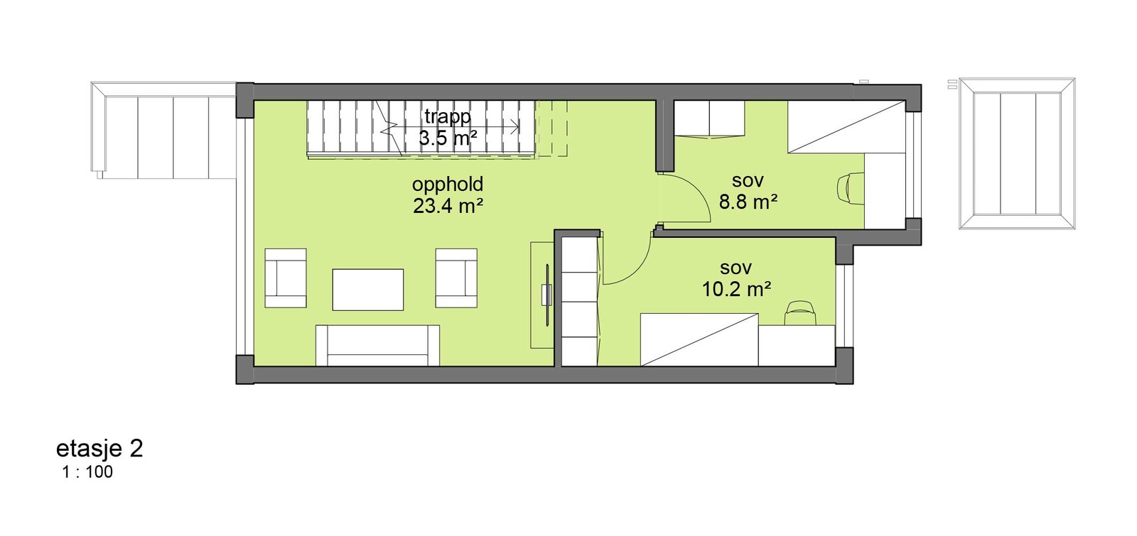 2. etasje: Stue og to soverom.