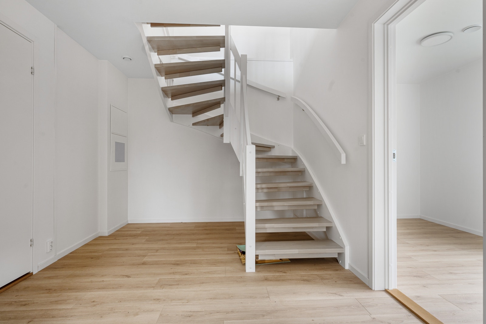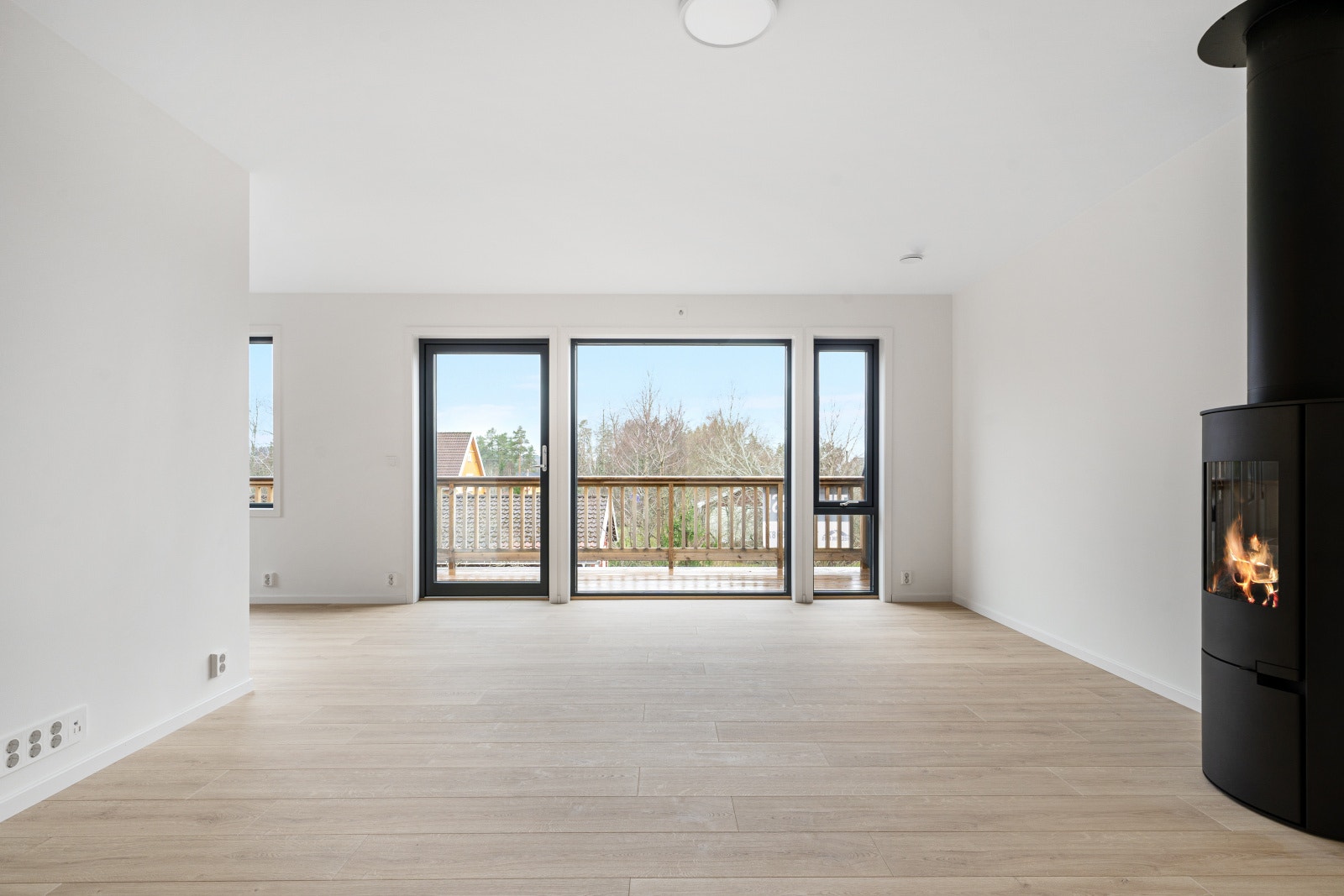 Boligen leveres med sparklet og malt gips på alle vegger i fargen klassisk hvit. Alle detaljer som lister og innvendige dører etc. leveres også i klassisk hvit. Det leveres listefritt mot tak.