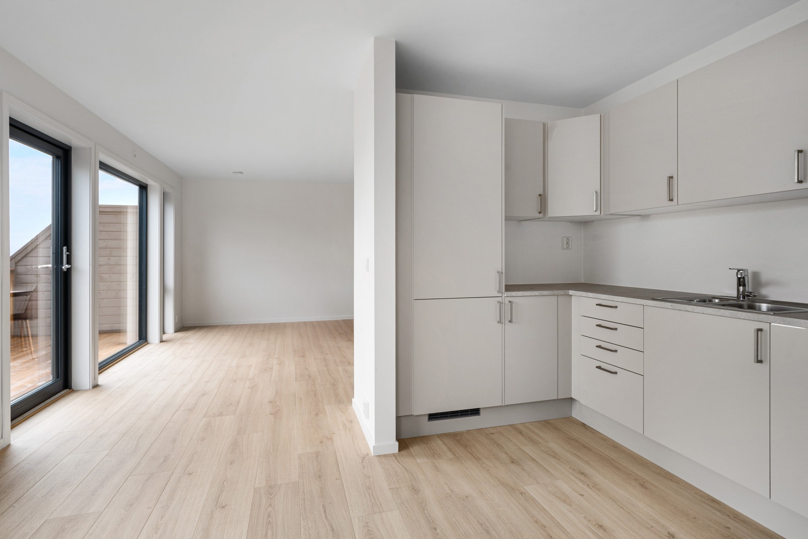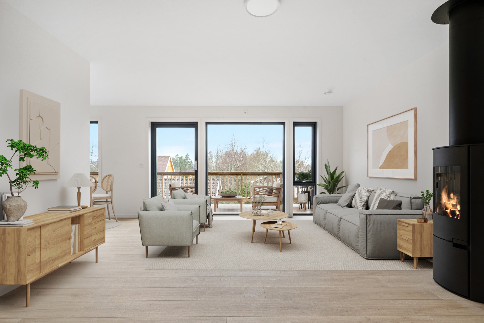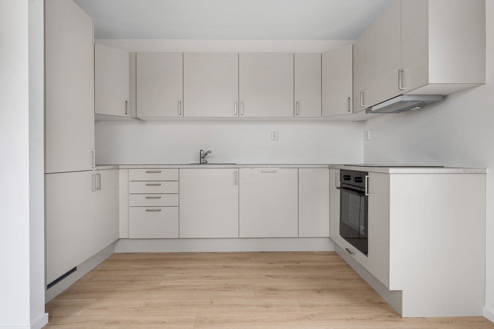 Gulv i alle oppholdsrom leveres i enstavs laminat i en lys farge. Begge bad leveres med fliser på gulv og vegger i delikate og tidløse farger.