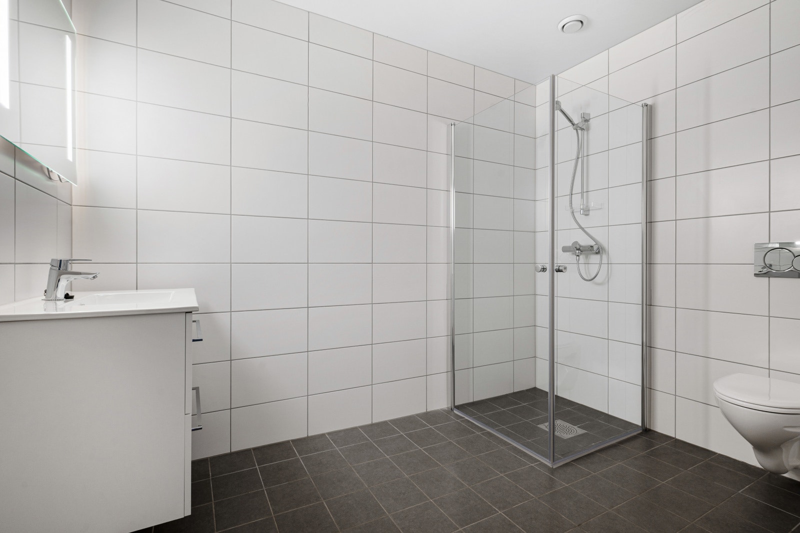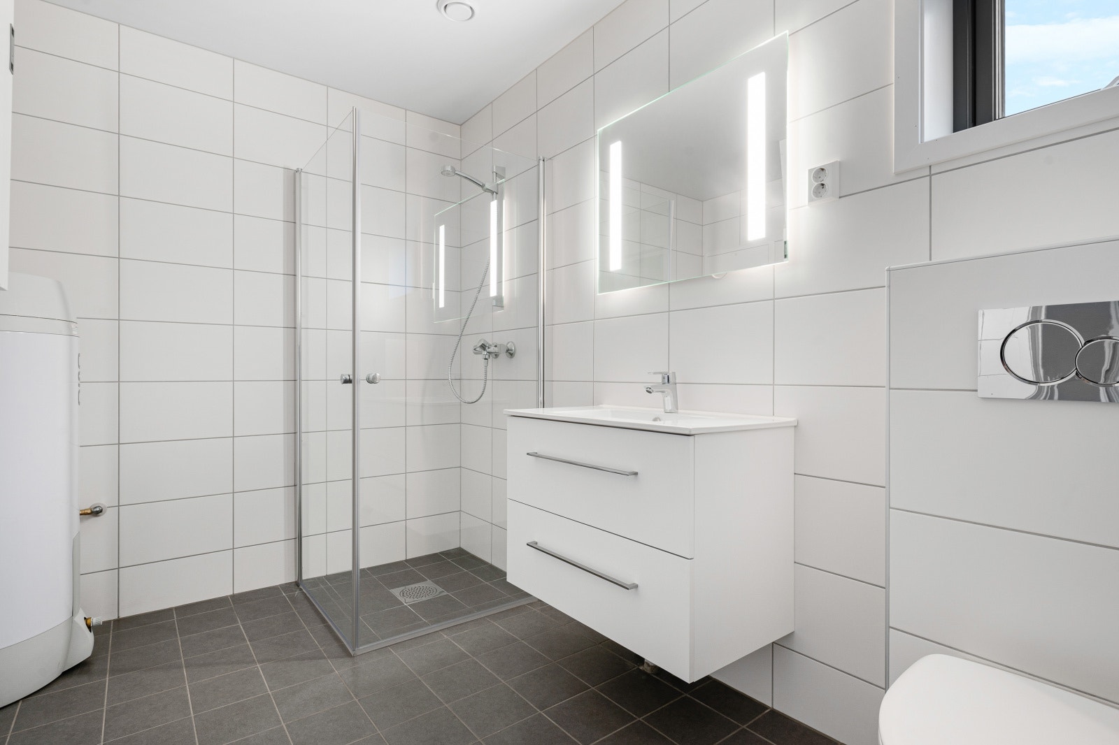 Baderom leveres med en pen innredning med skuffer i hvit utførelse, det leveres glassdører som kan felles inn til dusj og vegghengt toalett.