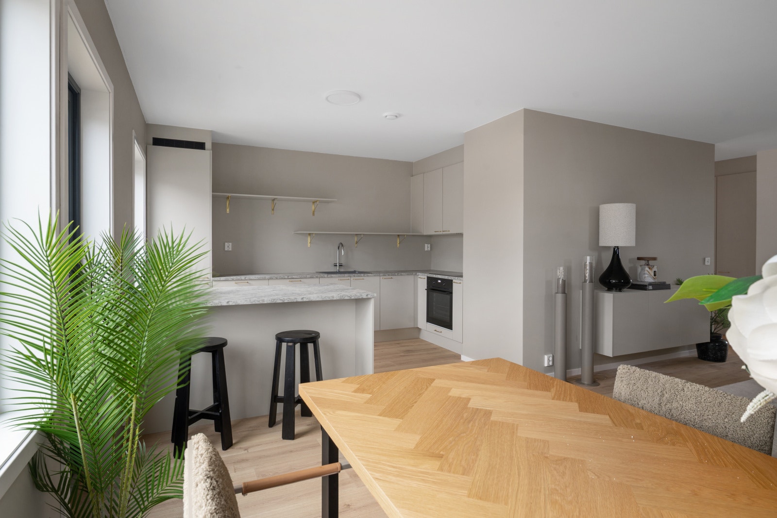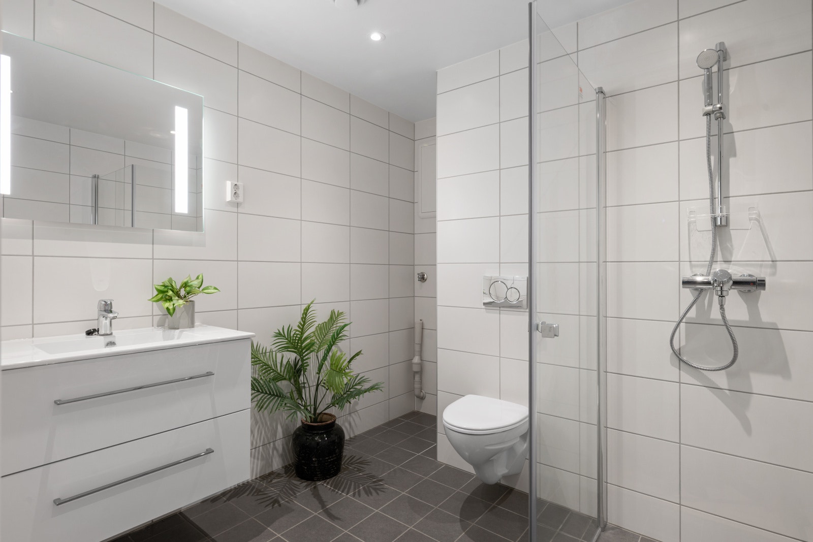 Smarte oppbevaringsløsninger gir en ryddig og funksjonell hverdag, samtidig som det løfter helhetsinntrykket i leiligheten. Badet i leiligheten har moderne grå fliser på gulvet og hvite, tidløse fliser på veggene. En praktisk fordel er den integrerte nisjen med plass til både vaskemaskin og tørketrommel, noe som gir en ryddig og funksjonell løsning uten at det går utover resten av rommet.