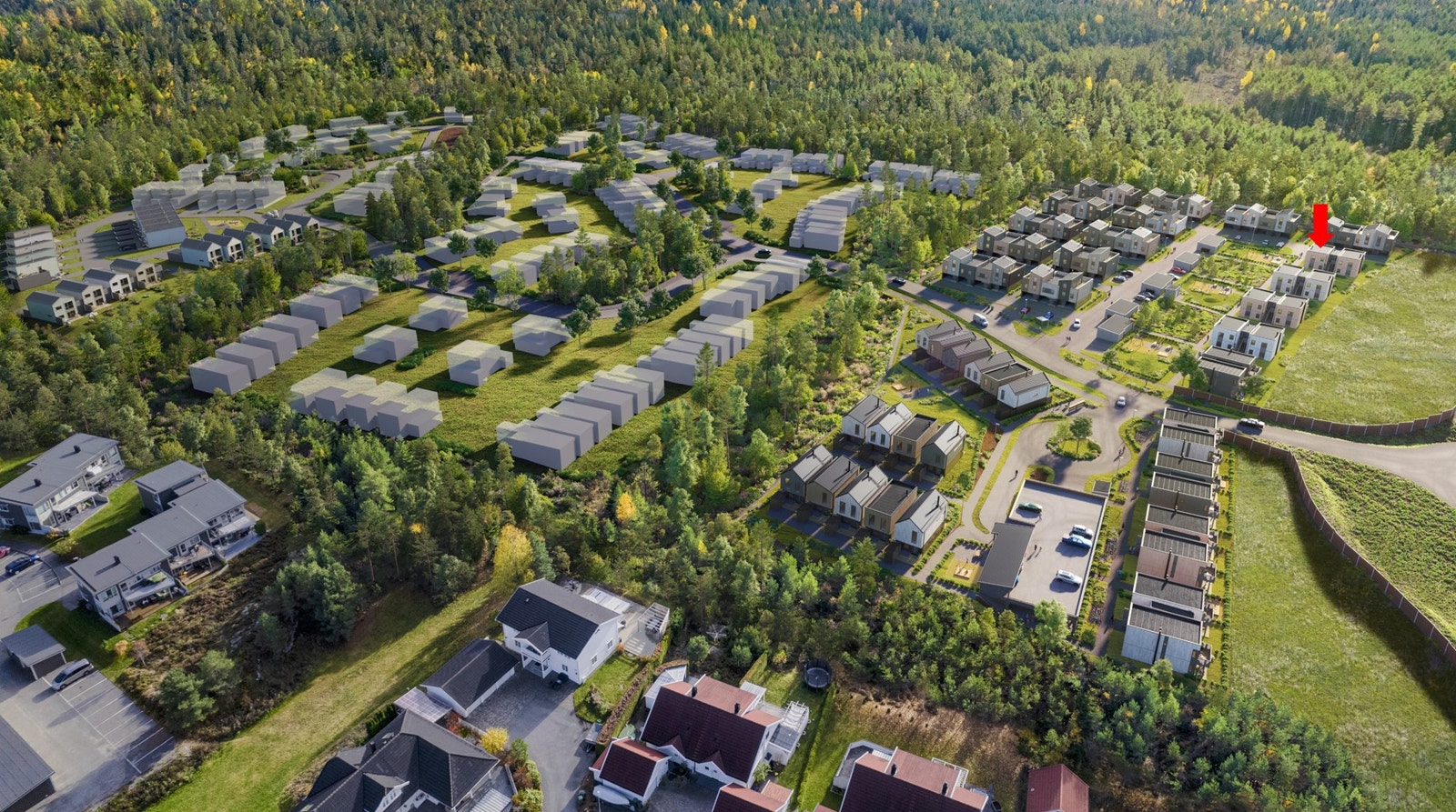 Nabolaget består av småhusbebyggelse. Her bor du tett på naturen, samtidig som du har nærhet til alt du trenger i hverdagen som skoler, barnehager, butikker og servicetilbud.