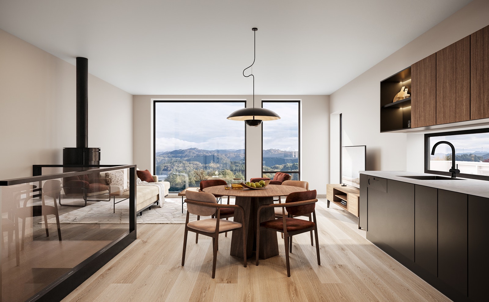 - Åpen stue/kjøkken-løsning med store vindusflater