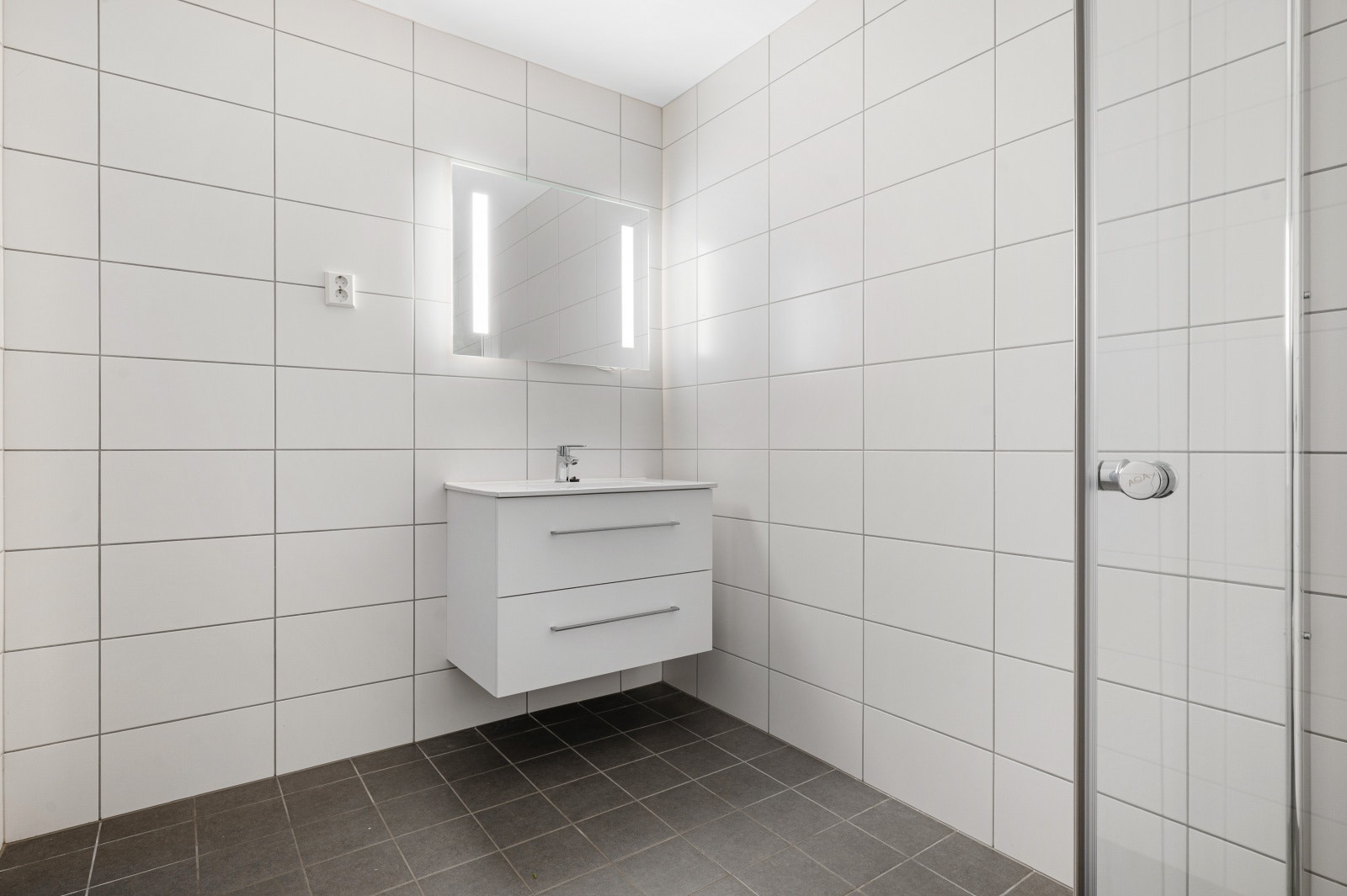 Det leveres flislagt gulv i gang og baderom med varmekabler. Vegger i bad leveres med fliser og en elegant hvit innredning med skuffer. Dusjdører som kan foldes inn og opplegg til vaskemaskin på ett bad.