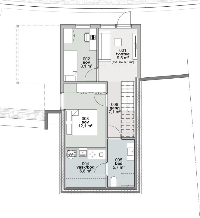 Underetasjen fungerer som en egen, privat soveavdeling – med egen utgang fra TV-stuen til uteområdet.