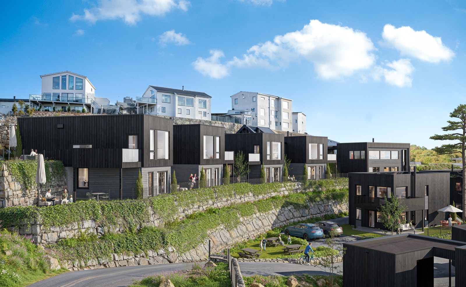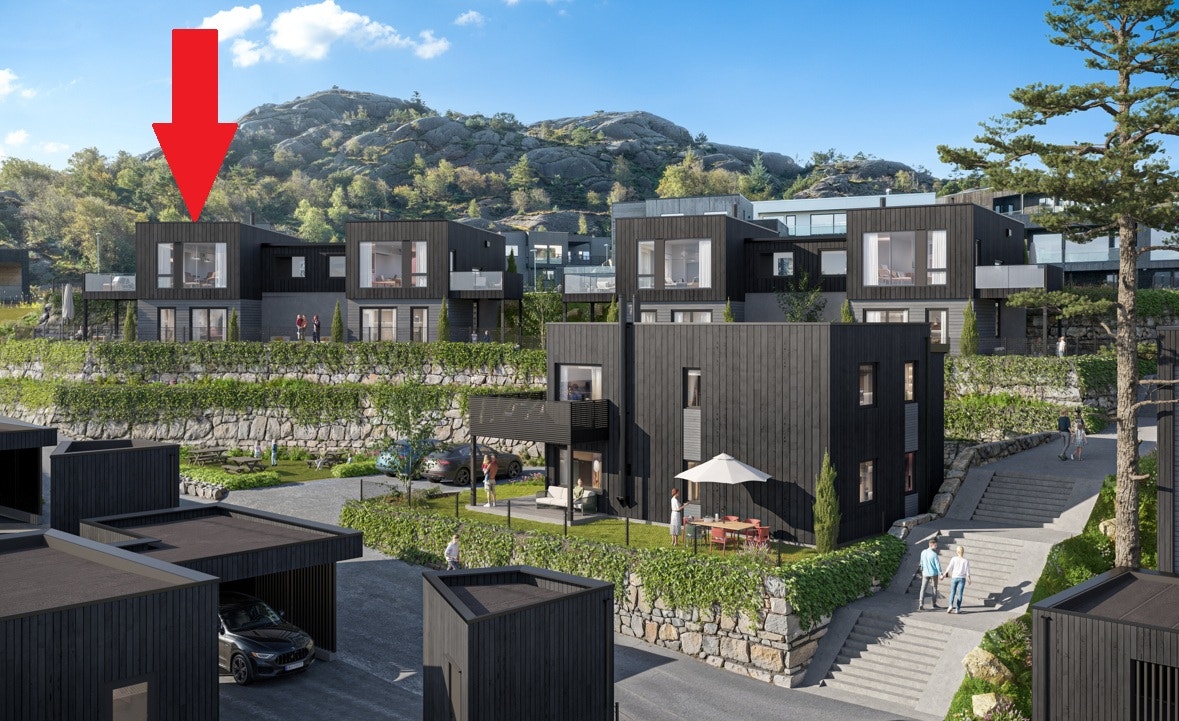 Rekken består av fire moderne eneboliger, plassert et nivå over tomannsboligen med trygg adkomst fra øvre vei. Her ligger boligene høyt og fritt med lune uteplasser og solrike kvaliteter.