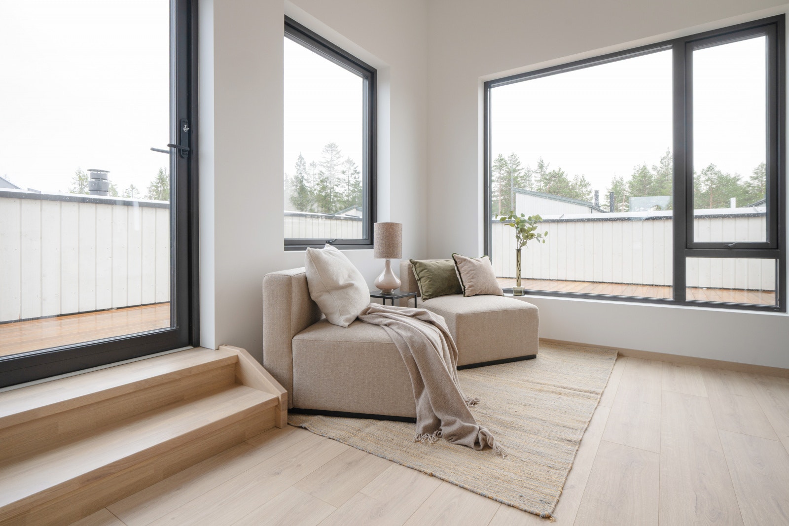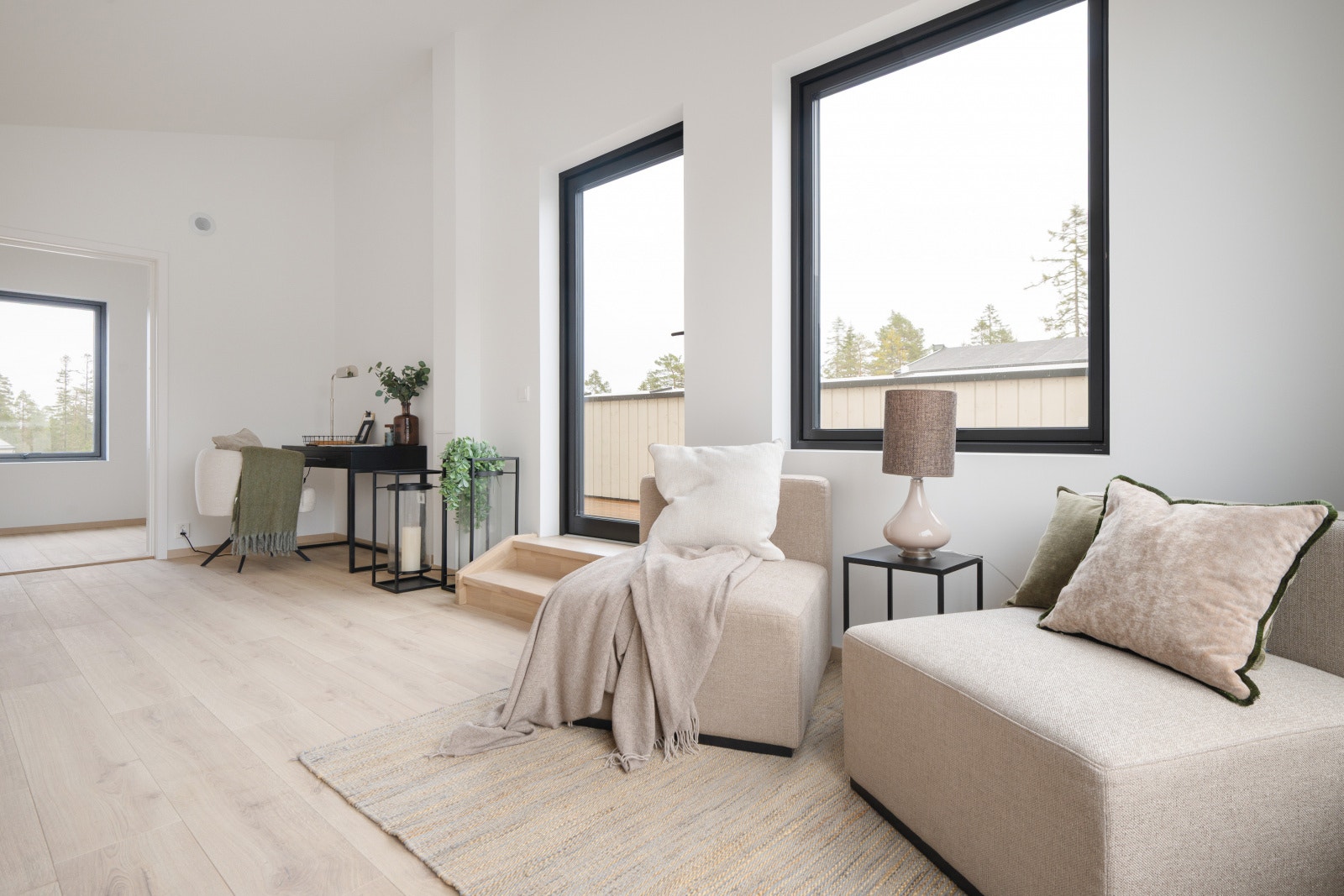 Møbler og løsøre som vist på illustrasjoner, herunder også belysning, inngår ikke i standardleveransen. Det henvises til kontraktstegning og leveransebeskrivelse som nærmere beskriver hva som leveres. Det tas forbehold om mindre endringer i utførelsen av uteområdene i forhold til beskrivelser og illustrasjoner som er vist i salgsmateriellet. Ved overlevering vil ferdigstillelsesgrad og tilvekst av vegetasjon og beplantning i uteområdene kunne ha kommet kortere enn det illustrasjoner viser.
