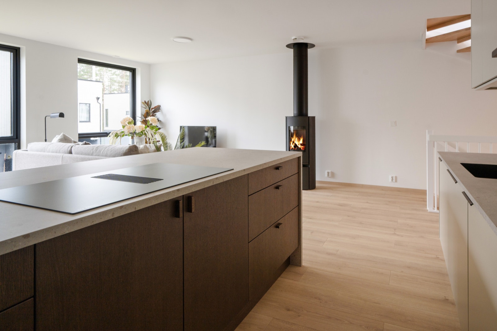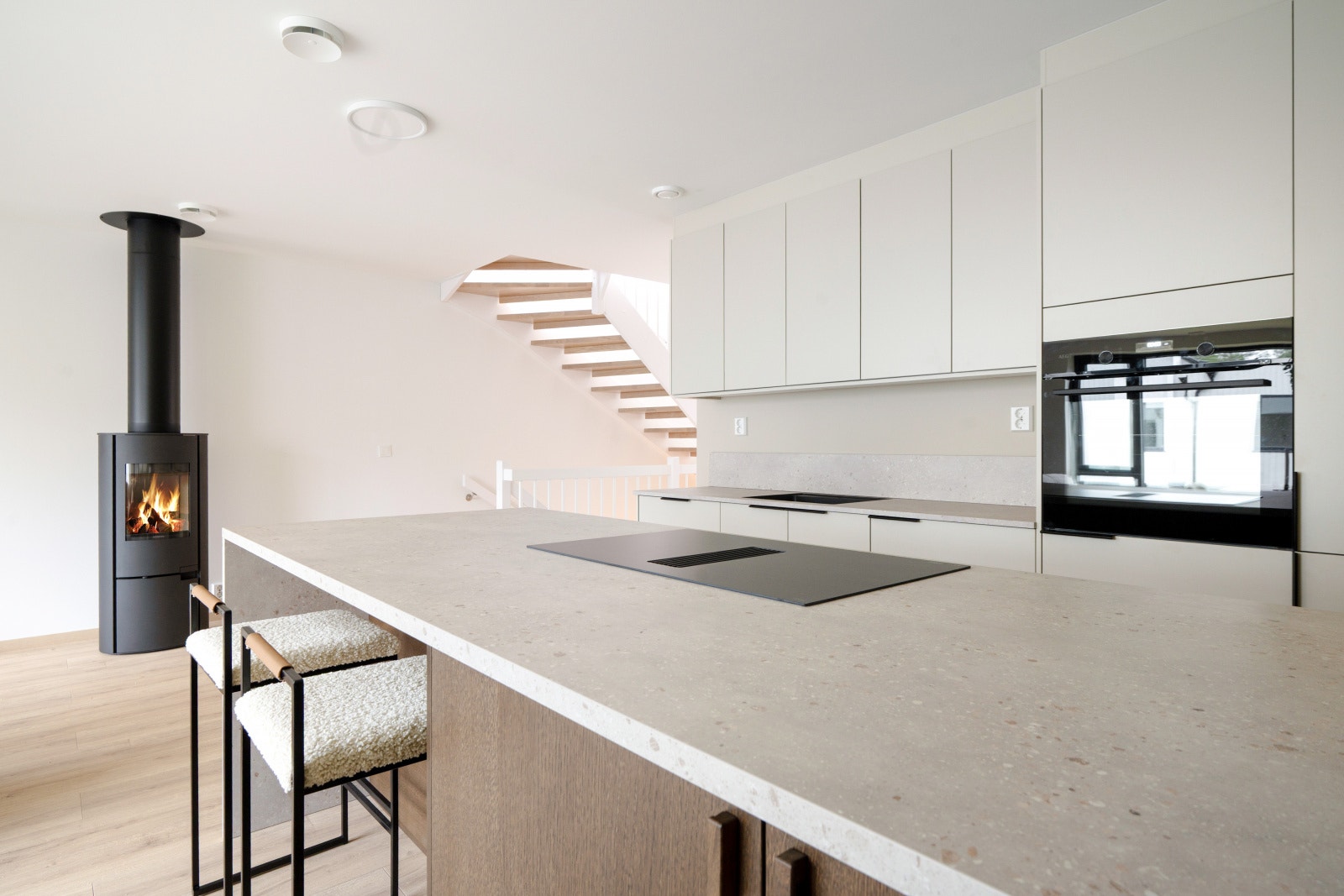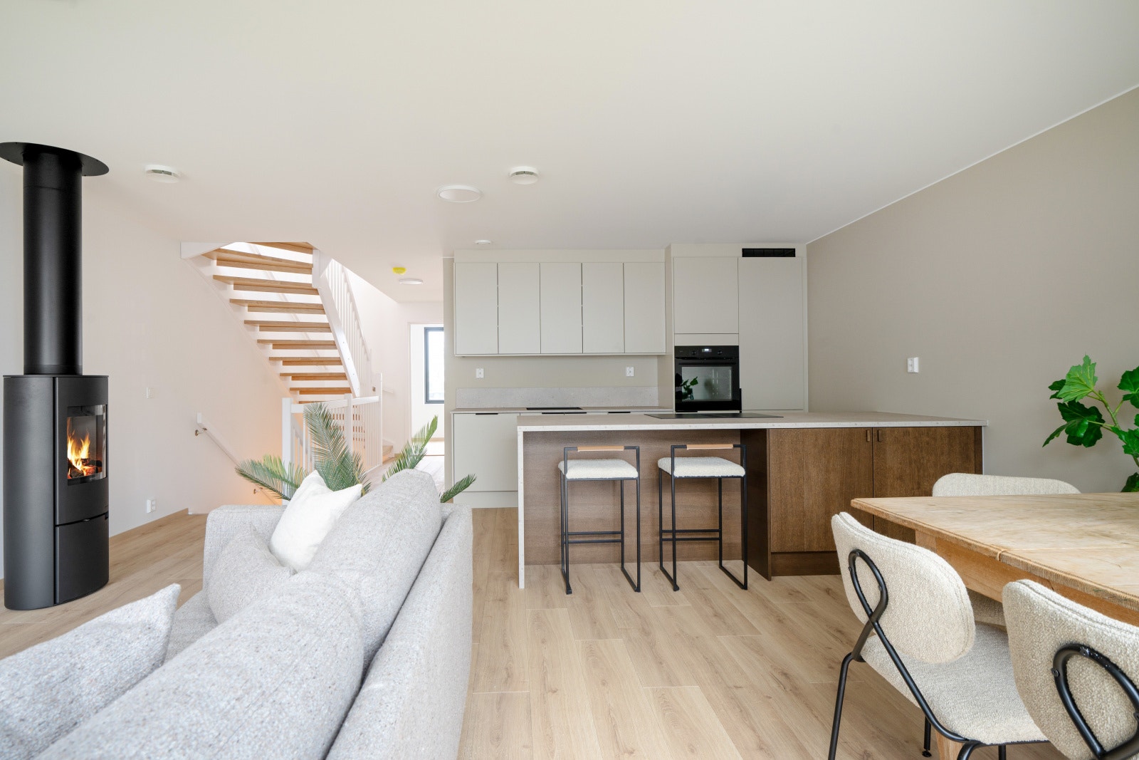 Trappen til andre etasje fører opp til et stort sosialt rom med kjøkken og stue. En kjøkkenøy gjør det mulig å lage mat og samtidig snakke med gjestene. Andre etasje består også av to soverom og et bad. Bolig D har en glass-skyvedør i andre etasje, som kan åpnes helt opp som en fransk balkong for å nyte både frisk luft og et nydelig måltid. Bolig C har tre etasjer med loftstue, et ekstra soverom og takterrasse.