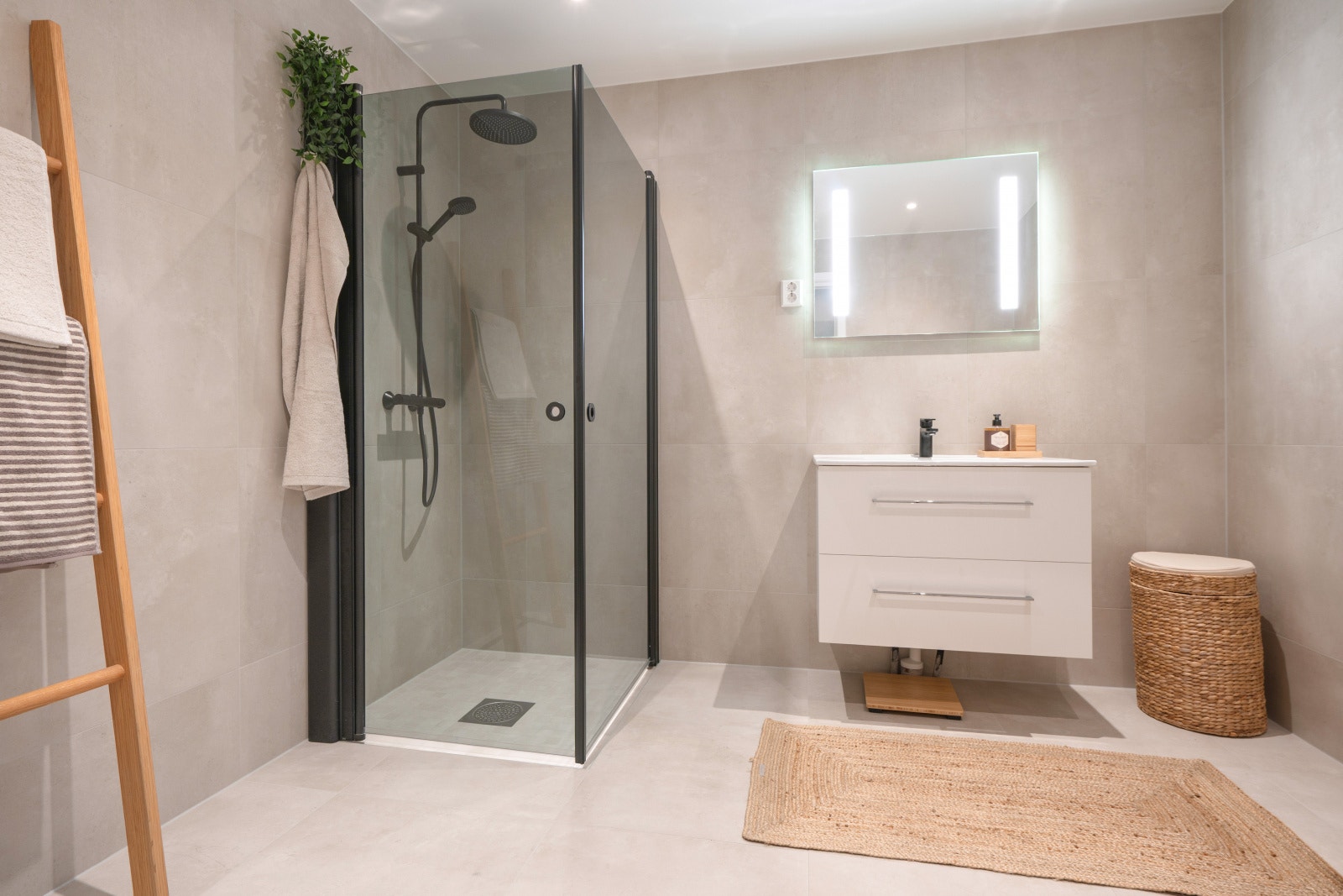 Rekkehusene har 2 bad, som får store 60 x 60 cm baderomsfliser i en delikat sandfarget tone. Ett av badene har plass til badekar som tilvalg. Badene får behagelig belysning med downlights, som du kan justere selv alt etter hvilket lys du trenger. Boligen har separat vaskerom med opplegg for vaskemaskin og tørketrommel. Vaskerommet har flislagt gulv med varme.