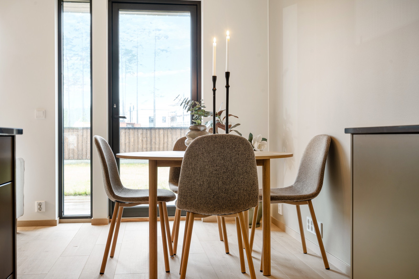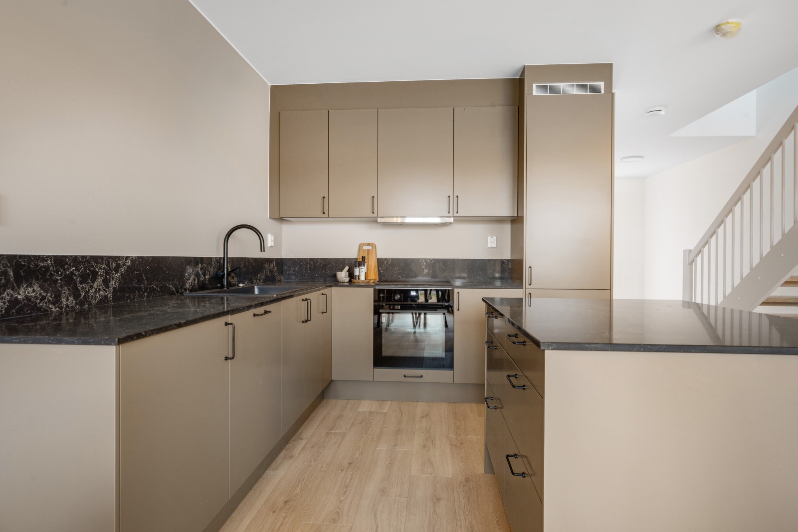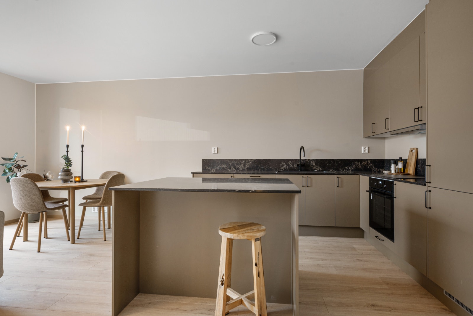 Eneboligene leveres med et stilrent kjøkken fra serien Uno. Uno er en «kameleon-modell» som tilpasser seg omgivelsene og blir akkurat det kjøkkenet du ønsker. Det er mulig å velge kostnadsfritt mellom 15 forskjellige frontfarger. Det gjøres oppmerksom på at kjøkkenet som er vist på bilder er oppgradert og er ikke standardleveranse.