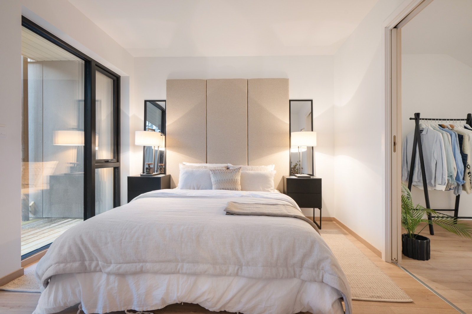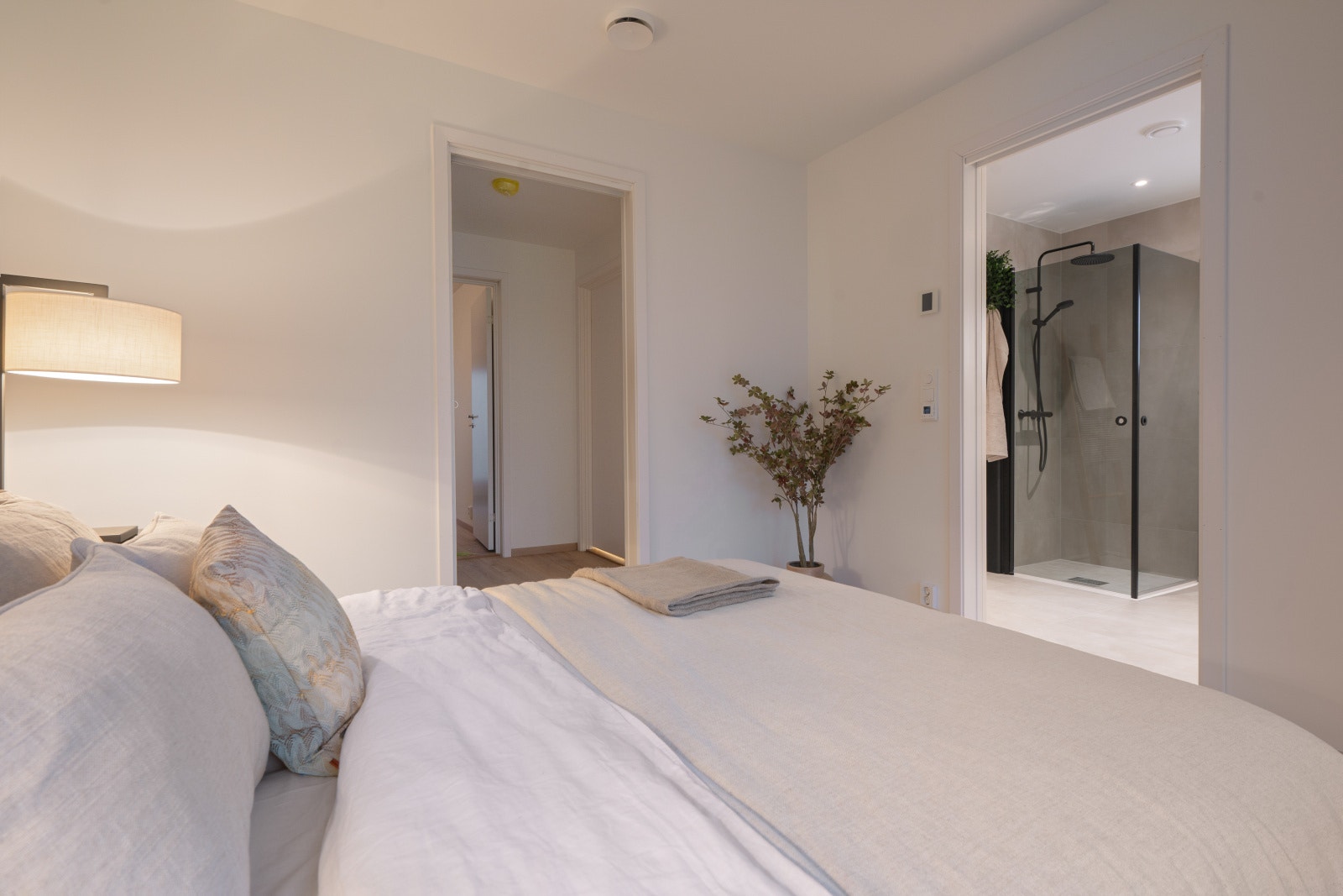 I første etasje ligger hovedsoverommet med utgang til terrasse og hage. Soverommet kan også brukes som en hyggelig tv-stue. Første etasje rommer i tillegg et stort bad med, en walk through garderobe med mye lagringsplass og bod/vaskerom med dør inn fra den åpne garasjen.