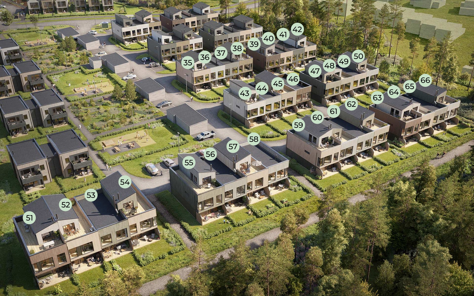 Vi utvider det første delfeltet med nye 2 og 3 etasjers rekkehus der boligene over 2 etasjer har en helt ny planløsning. Nabolaget vil bestå av leiligheter i firemannsboliger, rekkehus, tomannsboliger, eneboliger i kjede og eneboliger. Her bor du tett på naturen, samtidig som du har nærhet til alt du trenger i hverdagen som skoler, barnehager, butikker og servicetilbud.