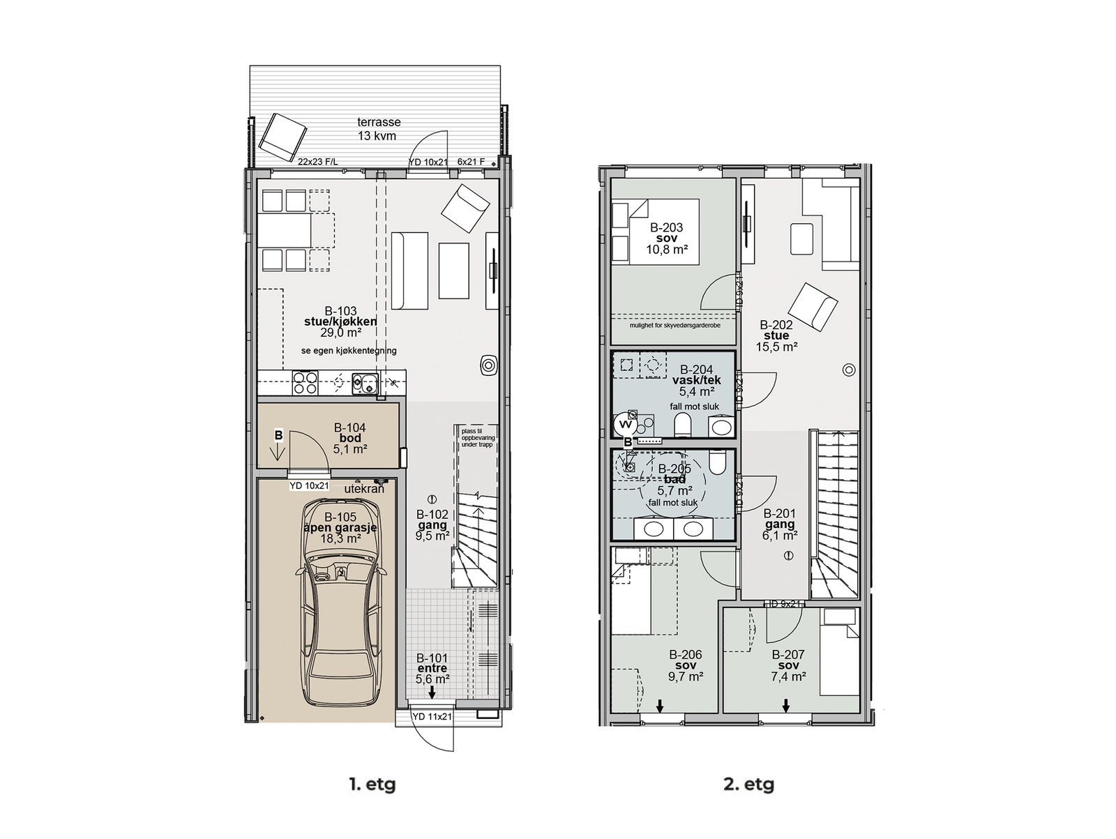 Første etasje byr på en lys og romslig stue- og kjøkkenløsning med god plass til både spisebord og sofagruppe, store vindusflater og direkte utgang til en solrik terrasse som forlenger oppholdsrommet. Første etasje har også en sportsbod og en integrert åpen garasje. En innbydende entré og romslig gang med trapp binder etasjene naturlig sammen.