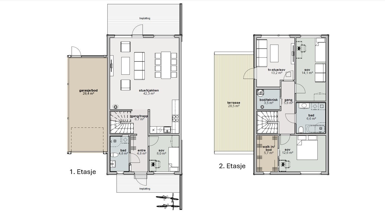 Alle eneboliger kommer med en egen garasjeplass og en biloppstillingsplass.